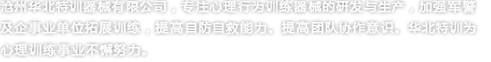 滄州華北特訓器械有限公司成立于2002年,是專業研發(fā)生產心理行為訓練器械、拓展器械、拓展器材、攀巖、兒童拓展器械的專業型企業,并通過ISO-9001質量管理體系認證及ISO-14001環(huán)境管理體系認證,致力于各職業群體提供的心理行為訓練器械、拓展器械、攀巖、兒童拓展器械等設備,使之不斷提升心理健康水平、充分開發(fā)自我潛能。我公司竭誠為廣大客戶提供專業化各類心理行為訓練器械相關產品和服務。
